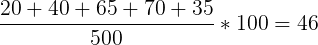 Suppose you have a total of 5 subjects and each subject is of 100 marks. You have scored 20 in subject 1, 40 in subject 2, 65 in subject 3, 70 in subject 4 and 35 in subject 5. Then what will be your total percentage?